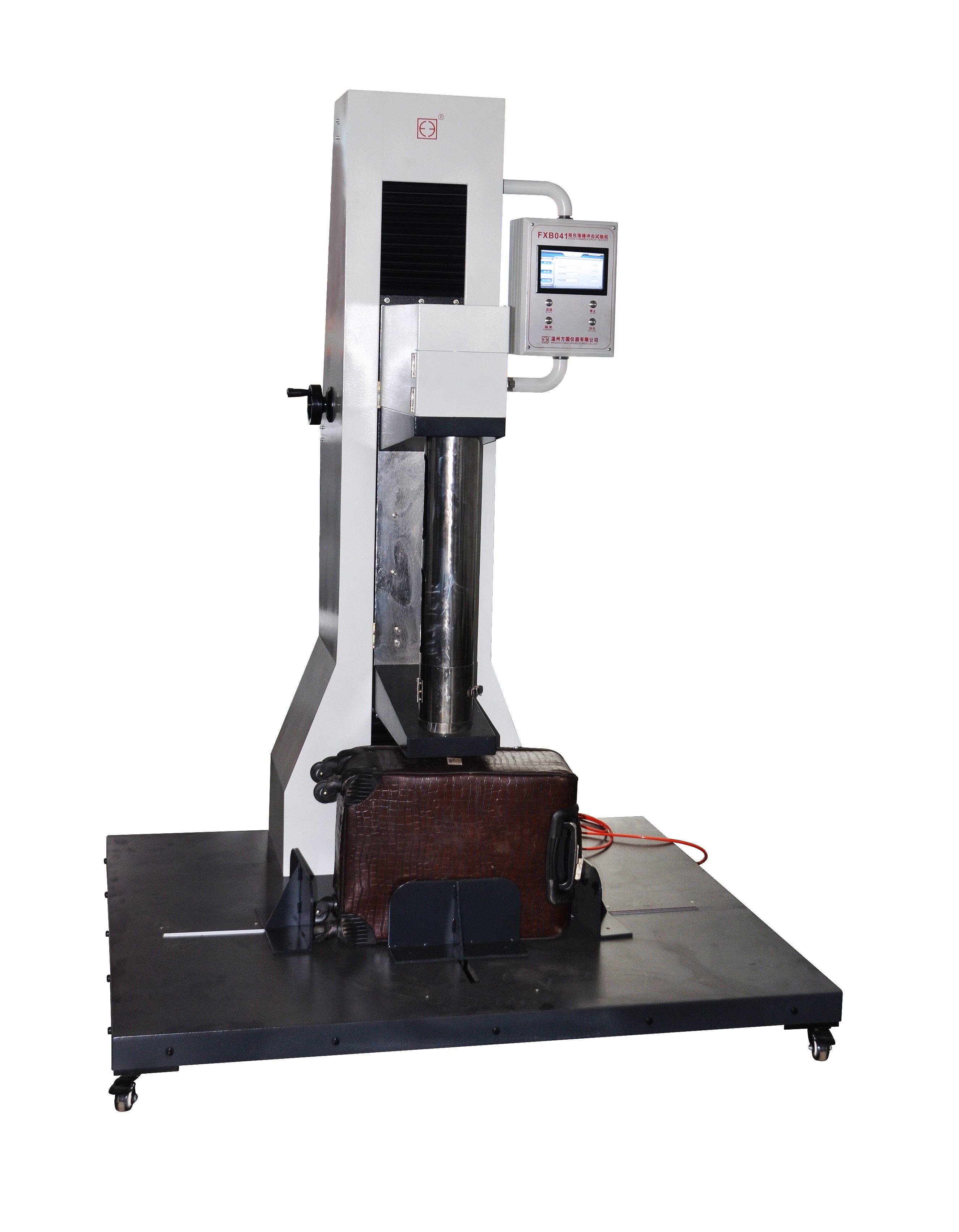 FXB041箱包落锤冲击试验机专用于检测箱包的耐冲击性能,符合QB/T2918《箱包 落锤冲击试验方法》等标准要求;适用于各类型、各规格的塑料箱壳的成型箱包的耐冲击程度检测。以规定重量的冲击头,调整到规定的高度,使之自由落下,打击样品,根据其受损程度,检测箱包的耐冲击性能。